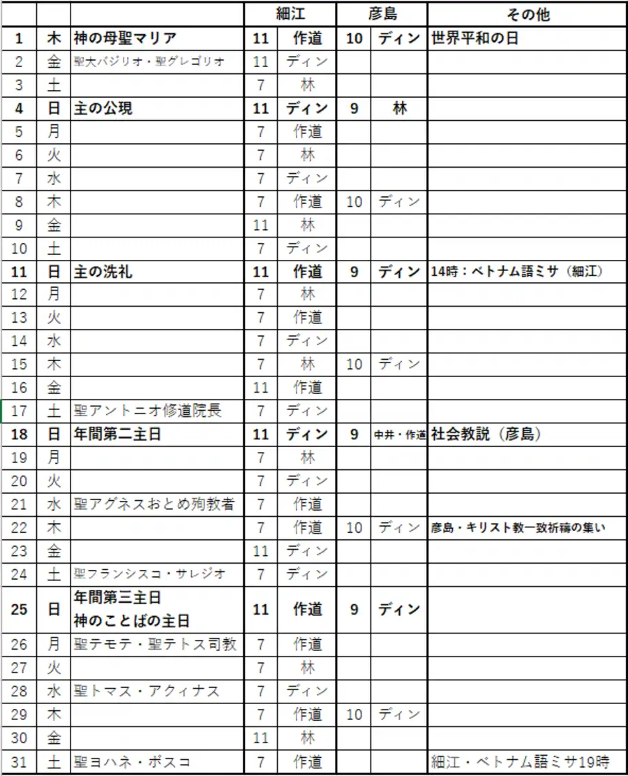 ⛪ » 細江 » 細江・お知らせ・行事 » 202601ミサ担当表