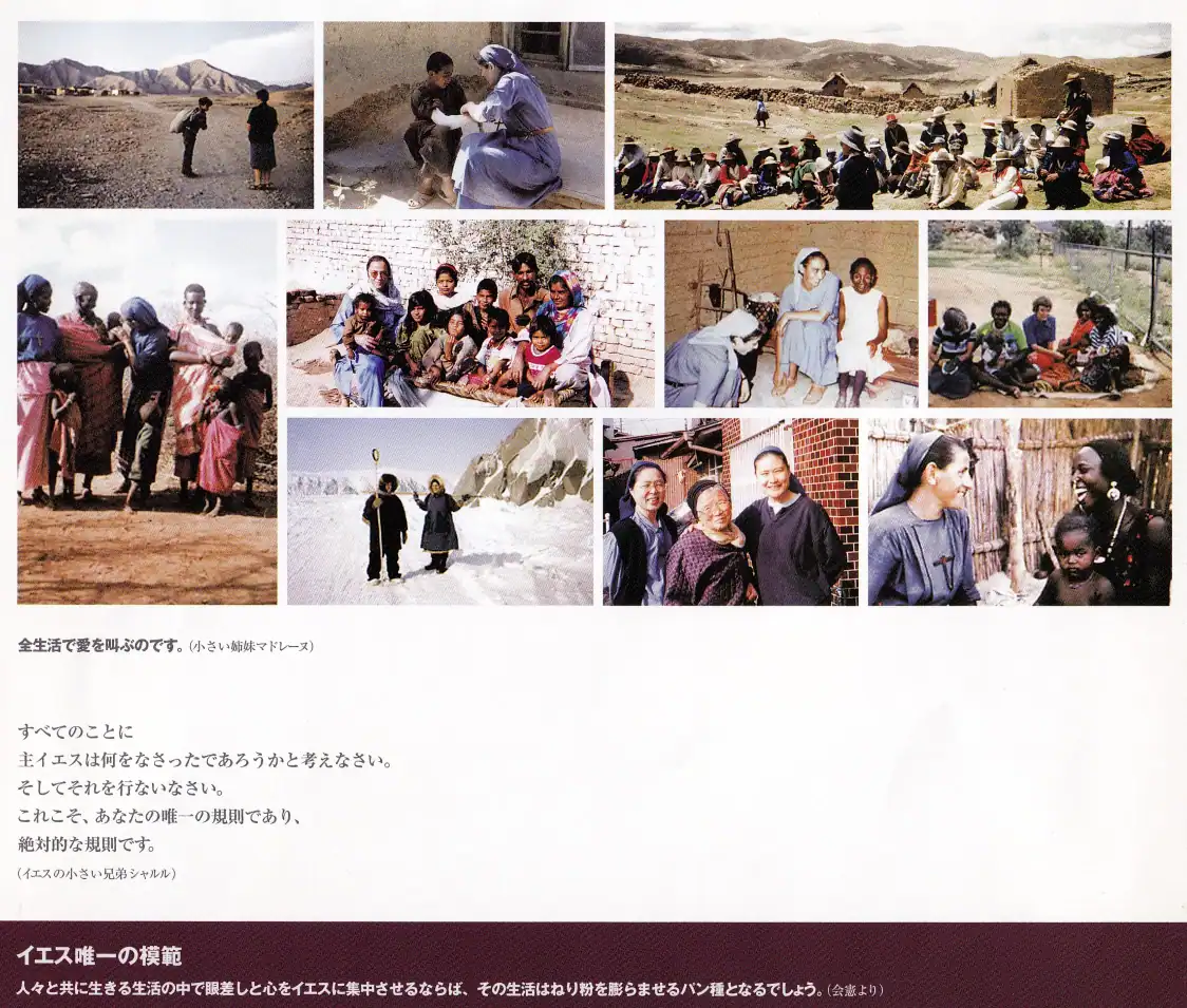 1952年、小さい姉妹マドレーヌは、小さい姉妹たちの理想を「小さい兄弟シャールの後を慕って」と題して、手紙の形で小冊子にまとめました。表紙の色から緑の小冊子と呼ばれているもので、教会の中に新しい修道生活の形を開き、人々に強いインパクトを与えました。